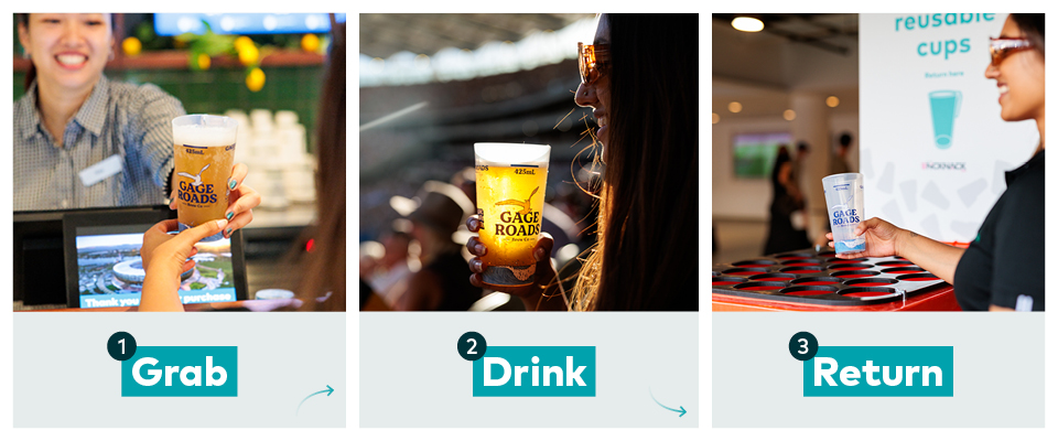 After enjoying your drink, simply return your cup to a designated reusable cup bin. All cups are collected after the event, then washed and sanitised offsite by FSG NickNack before being reused at future games and events.