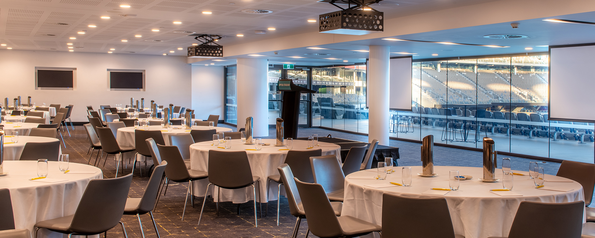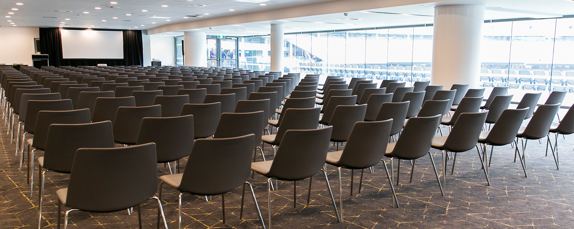 This high-end setting offers playing surface views and is equipped for various function types, including business lunches or breakfast briefings.